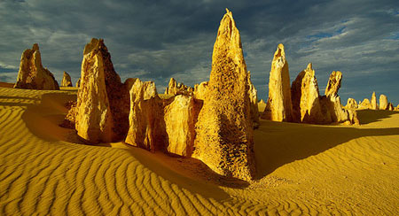 Estas hermosas formaciones de piedra caliza están ubicadas en el Parque Nacional de Namburg en el oeste de Australia. Los Pináculos se formaron a partir de una lixiviación (lavado) de la cal y por la lluvia, procesos que consolidaron los niveles más bajos de la duna en una piedra caliza suave.