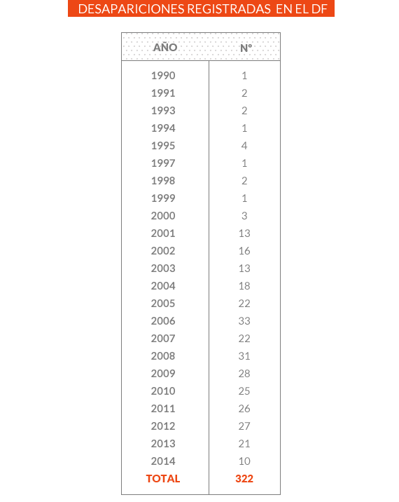 Si se revisan las fechas de desaparición puede verse que el peor año entre 1990 y mediados de 2014 en la zona conurbada de la Ciudad de México ha sido 2006, con 55 casos.