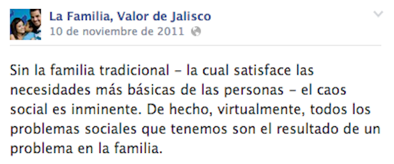 No queremos imponer nuestras ideas, pero tampoco queremos que ideas minoritarias sean impuestas a nuestra sociedad por acuerdos cupulares o por conveniencia política; por ello, creemos que en cualquier debate respecto de un tema tan primordial para nuestra sociedad como la familia debe forzosamente involucrar a toda la sociedad, de tal forma en que sean los individuos que la integran quienes libremente decidan qué concepto de familia tendremos como sociedad, sin que se nos impongan modelos ajenos a nuestra comunidad o a nuestros valores fundamentales como jaliscienses".