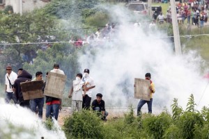 PUEBLA, PUEBLA, 09JULIO2014.- Pobladores de distintas comunidades del municipio de Atlixco, que bloquearon la autopista Puebla-Atlixco en contra del cierre de los registros civiles en todas las juntas auxiliares de la ciudad, sostuvieron un enfrentamiento por más de tres horas con la policía estatal que pretendía reabrir la circulación vehicular. Hasta el momento se reportan cuatro lesionados, dos policías y dos niños además de una decena de policías retenidos por los pobladores.