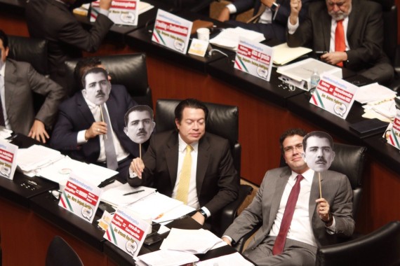 Las caritas del General Cárdenas habían sido colocadas en el lugar del Senador perredista Zoé Robledo Aburto, desde donde se repartieron a los 22 integrantes de la bancada.