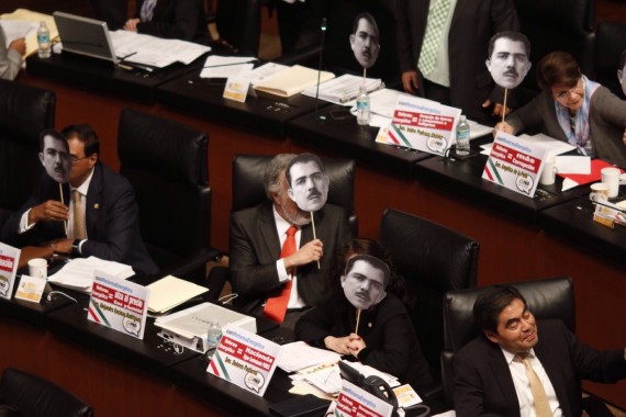 Cuando ha pasado aproximadamente la mitad de los 45 senadores inscritos para expresar sus opiniones a favor y en contra del primer dictamen relativo a la creación de la nueva Ley de Hidrocarburos, los perredistas usaron las caritas y luego las colocaron frente a su escaño.