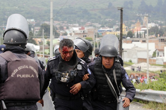 - Enfrentamiento del 9 de julio pasado, entre habitantes de juntas auxiliares de Puebla con policías. Foto: Cuartoscuro