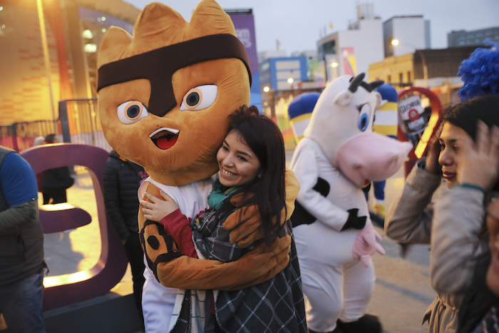 Una espetadora abraza a Milco, la mascota oficial de los Juegos Panamericanos. Foto: Rodrigo Abd, AP