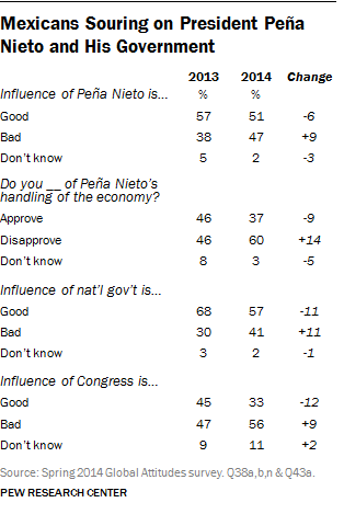 Sin embargo, el estudio del Centro de Investigación Pew –un think tank con sede en Washington DC– expuso que la caída en la imagen del mandatario priista se debió, principalmente, por la desconfianza sobre el efecto que tendrán sus reformas económicas y también por la inseguridad y corrupción que percibe la ciudadanía.