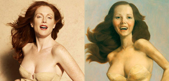 Lindbergh expone los retratos de Moore al lado de sus inspiraciones originales, para ser vistas, como en un museo. Llama la atención el meticuloso trabajo de arte, que hace eco de las consagradas obras, pero que también rescata la importancia de la alta costura. Por su parte, la actriz realizó un espléndido trabajo de interpretación de las musas originales, reviviendo incluso el vigor y glamour de la famosa “La coja” de John Currin.