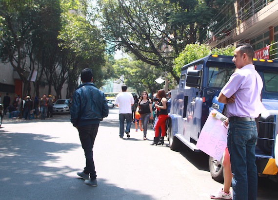 A lo largo de la calle, desde Río Hudson hasta Circuito Interior, se ven grupos de personas platicando, con cartulinas, flores y muñecos de peluche.