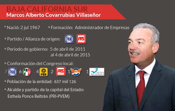 Baja California Sur es uno de los estados de la República Mexicana con mayor alternancia política, ya que durante los últimos 19 años ha sido gobernado por un priísta, dos perredistas, y, a partir de abril de 2011, por un panista. Pero Marcos Alberto Covarrubias Villaseñor, actual gobernador de Baja California Sur, ni es sudcaliforniano ni creció políticamente entre las filas panistas. Originario de Guadalajara, Jalisco, Covarrubias estudió Administración de Empresas en la Universidad del Valle de Atemajac. Es, además, católico, socio de la empresa Abastecedora de Envases de Plásticos y Derivados y accionista de Agrícola Comandú.