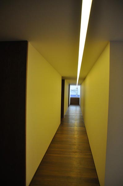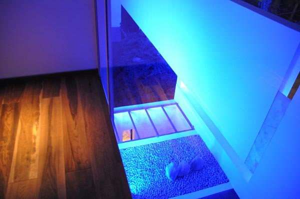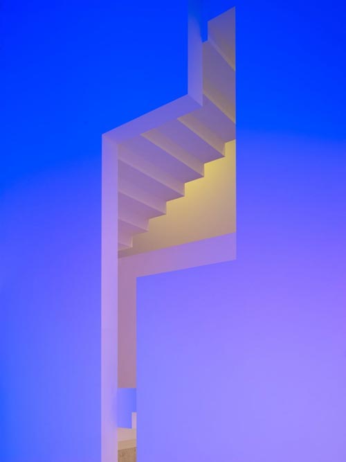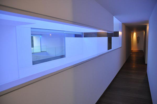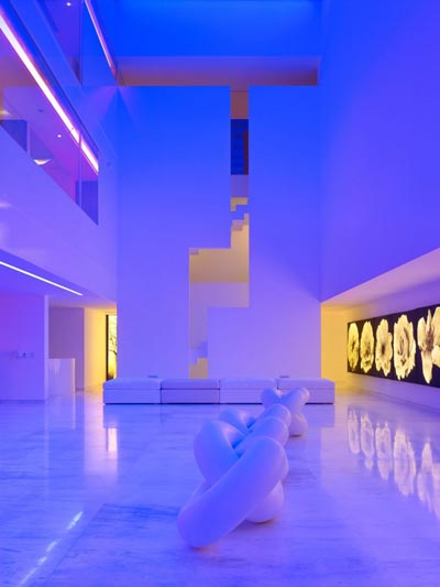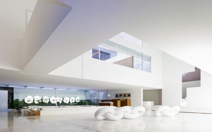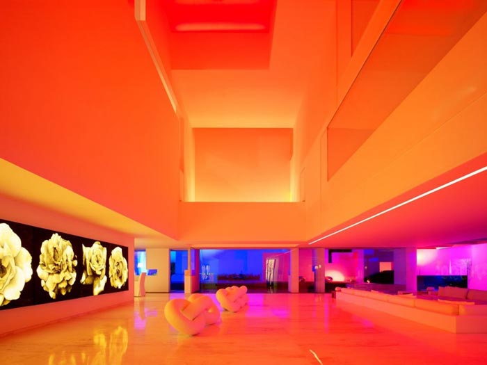 El color blanco cubre toda la casa, la cual tiene un sistema de luces para crear ambientes: puede tornarse rosa, naranja o violeta. Desde la calle pueden observarse las dos palmeras que crecen en el jardín.
