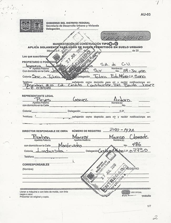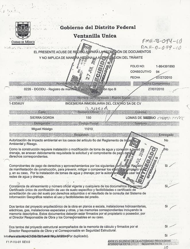A través de solicitudes de transparencia, la Delegación Miguel Hidalgo entregó copias de los trámites de la obra. Todo el papeleo fue hecho por Arturo Reyes Gómez, en representación de "Ingeniería Inmobiliaria del Centro", de Grupo Higa.