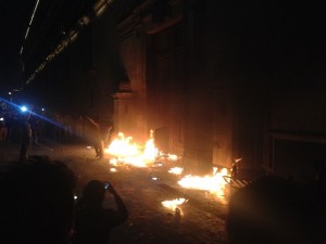 MÉXICO, D.F., 08NOVIEMBRE2014.- Manifestantes que salieron de la PGR en apoyo a los normalistas de Ayotzinapa desaparecidos hace 40 días, rayan y patean la puerta de Palacio Nacional en el Zócalo.