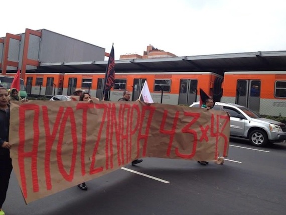 Los manifestantes, que se han relevado en turnos desde su salida del pueblo donde el 26 y 27 fueron secuestrados por policías los estudiantes, lanzan exigen la renuncia del Presidente Enrique Peña Nieto.