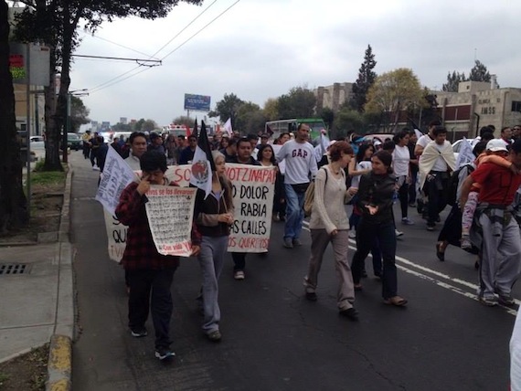En su último día del recorrido desde Guerrero hasta la Ciudad de México, los manifestantes avanzaron sobre Calzada de Tlalpan. Conforme recurrieron la avenida, se rumaron personas. Al Zócalo llegaron este mediodía. A su paso, personas se han solidarizado regalando frutas y agua a los caminantes. Otros muestran pancartas con frases de repudio al gobierno y clamores de justicia para Ayotzinapa.