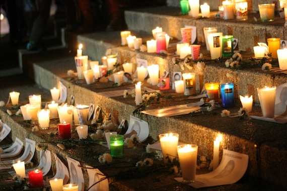 Con cantos, flores velas y fotografías, los manifestantes, entre los que se encontraban algunos artistas, se reunieron en este monumento formando filas para asemejar un coro que entonó una melodía.