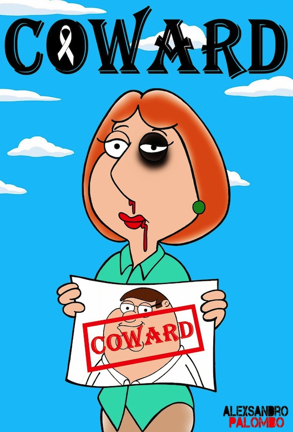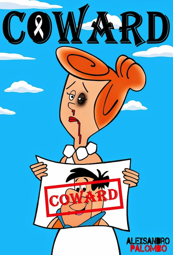 Marge, Lois, Ariel, Blanca Nieves, Jazmín, Oliva, Cenicienta y Vilma Picapiedra, son los personajes que aparecen golpeadas y con la imagen de sus esposos con la palabra "cobarde". Estas ilustraciones forman parte del blog del artista "Humor Chic".