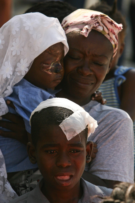 20 DE ENERO, 2010.- Decenas de haitianos sufren por las heridas y la devastación. Una familia mal herida busca ayuda. FOTO: ISAAC ESQUIVEL