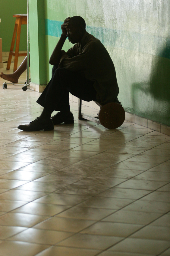 20 DE ENERO, 2010.- En el hospital Renaissance, uno de los principales lugares en atender a los heridos por el terremoto, un hombre se duele en la espera. FOTO: ISAAC ESQUIVEL