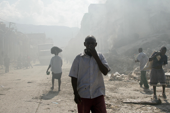 20 DE ENERO, 2010.- La ciudad está cubierta de contaminación; la gente intenta cubrirse la nariz para soportar la pestilencia de los muertos. FOTO: ISAAC ESQUIVEL