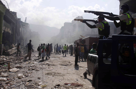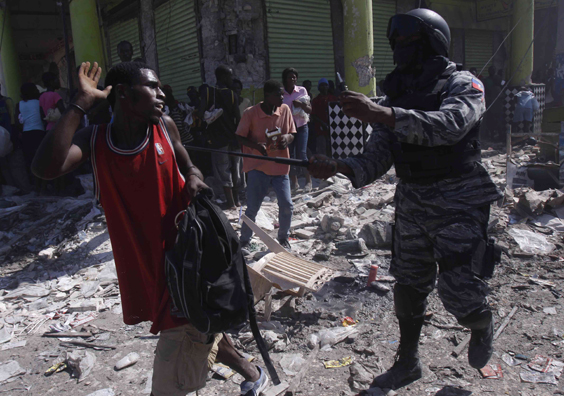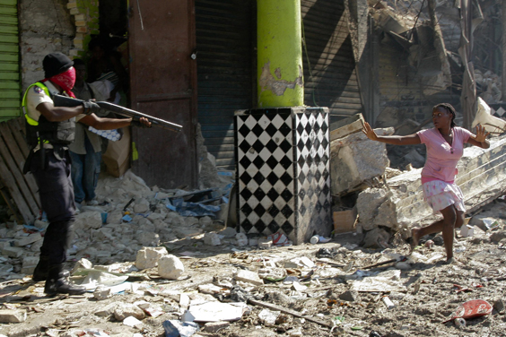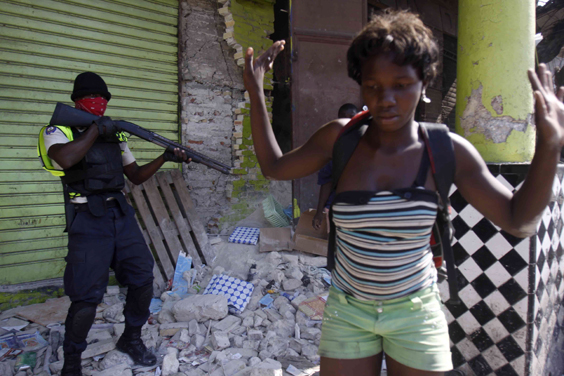 20 DE ENERO, 2010.- Policías realizan patrullajes en las calles de Puerto Príncipe para detener los saqueos a comercios ante la falta de alimento y comida. Una mujer, asustada, levanta la mano. FOTO: ISAAC ESQUIVEL