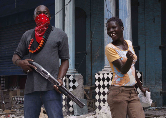 19 DE ENERO, 2010.- Un policía intenta detener los saqueos en el centro debido a la lenta distribución de la ayuda humanitaria. Una mujer, en la cadencia de la huída, sonríe. FOTO: IVAN STEPHENS