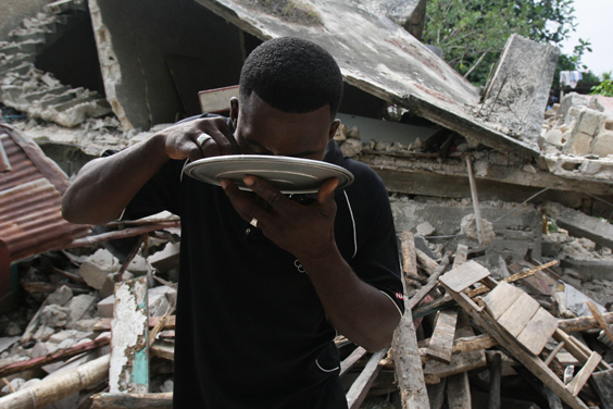 19 DE ENERO, 2010.- Un hombre come un plato de arroz frente a su casa destruida por el sismo del 12 de enero. Se calcula que en Leogane, una zona campesina de Haití, alrededor del 80 por ciento de las construcciones fueron destruidas o dañadas, por lo que las personas tienen que cocinar, comer y dormir en la calle. FOTO: ISAAC ESQUIVEL