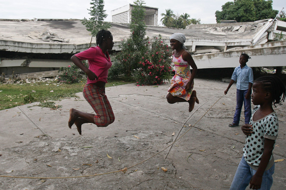 19 DE ENERO, 2010.- Niñas saltan la cuerda frente a lo que fue un colegio, que quedó destruido luego del sismo. FOTO: ISAAC ESQUIVEL