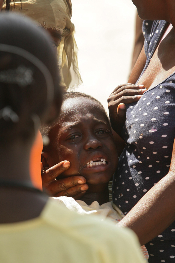 20 DE ENERO, 2010.- Un niño llora por el dolor al ser atendido de las heridas provocadas por el terremoto. FOTO: ISAAC ESQUIVEL
