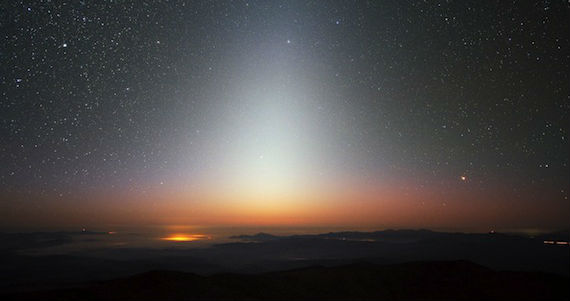 Cielo estrellado, con una brillante columna producida por la luz zodiacal, ilumina el  desierto de Cerro Paranal. Foto: ESO