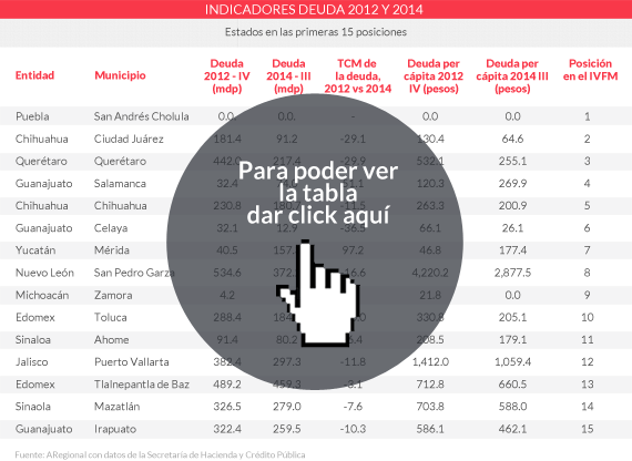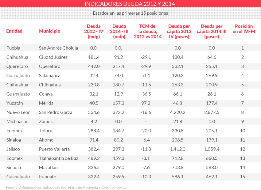 Dentro del índice están dos municipios que registraron un incremento importante de deuda en comparación con 2012. Salamanca (Guanajuato) aumentó su deuda de 32.4 millones de pesos a 74 millones de pesos, mientras que Mérida (Yucatán) pasó de los 40.5 millones de pesos a 157.3 millones de pesos.