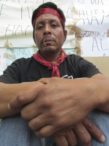 TUXTLA DE GUTIÉRREZ, CHIAPAS, 02DICIEMBRE2014.- Familiares del preso indígena chiapaneco Florentino Gómez se "crucificaron" en las puertas del Congreso Local, como medida de presión para exigir la liberación del detenido el pasado 1 de mayo, quien se encuentra detenido presuntamente por el delito de robo de siete cabezas de ganado. Desde hace 14 días su esposa sus hijas y su hermano mantienen una huelga de hambre.