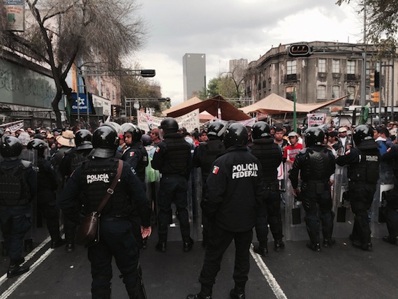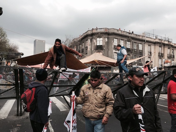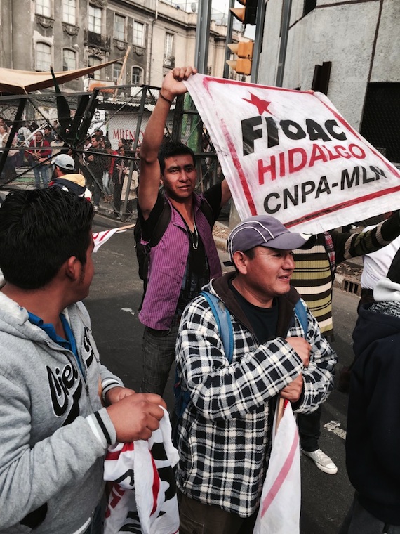 Además se manifiestan habitantes del Estado de México que reclaman derechos sobre los terrenos federales del ex Lago de Texcoco en que el gobierno de Enrique Peña Nieto proyecta el nuevo Aeropuerto Internacional de la Ciudad de México.