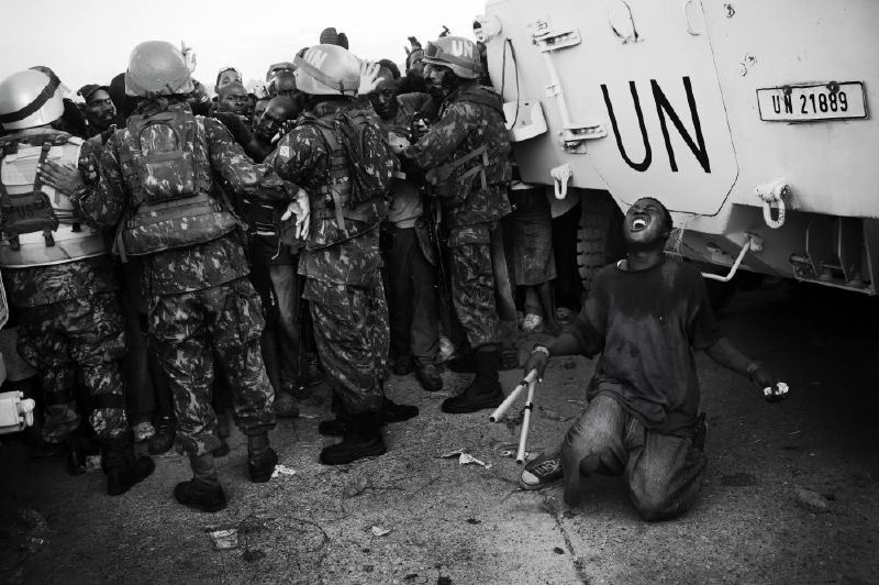 Entre las fotografías de Cazalis hay una que muestra a un muchacho arrodillado y gritando tras una valla humana de tropas brasileñas de los Cascos Azules de Naciones Unidas, quienes intentan contener a una multitud de haitianos. El gesto del muchacho es como de una desesperada imploración, pero no a las tropas ni a la multitud. Su rostro se inclina hacia el cielo. El fotógrafo cuenta que minutos antes de que la capturara, en ese lugar habían estado diplomáticos brasileños, acompañados de la prensa. Todo había transcurrido en orden hasta que los funcionarios y la prensa se retiraron; entonces los soldados brasileños perdieron el control de la situación.