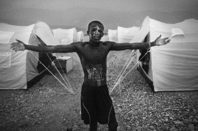 - Un haitiano toma una ducha bajo el rocío de la lluvia, poco después de llegar al campamento Corrail ubicado en las afueras de la capital haitiana como refugio para las personas desplazadas por el terremoto. Tan sólo 60 haitianos fueron trasladados a este lugar el primer día, de los más de 50.000 habitantes en la Petionville Club que llegaron a este lugar. El Ejército de los Estados Unidos, las Naciones Unidas, los Organismos No Gubernamentales locales y extranjeros que prestaron su apoyo para refugiar a los haitianos en este sitio, desaparecieron en minutos con la llegada de la tormenta, abandonando a los que recién llegaban a este destino. Alrededor de 1,5 millones de personas se quedaron sin hogar debido al terremoto. Seis meses después de ese trágico día, 5.000 personas no tienen expectativas reales para ganarse la vida. Foto: Carlos Cazalis