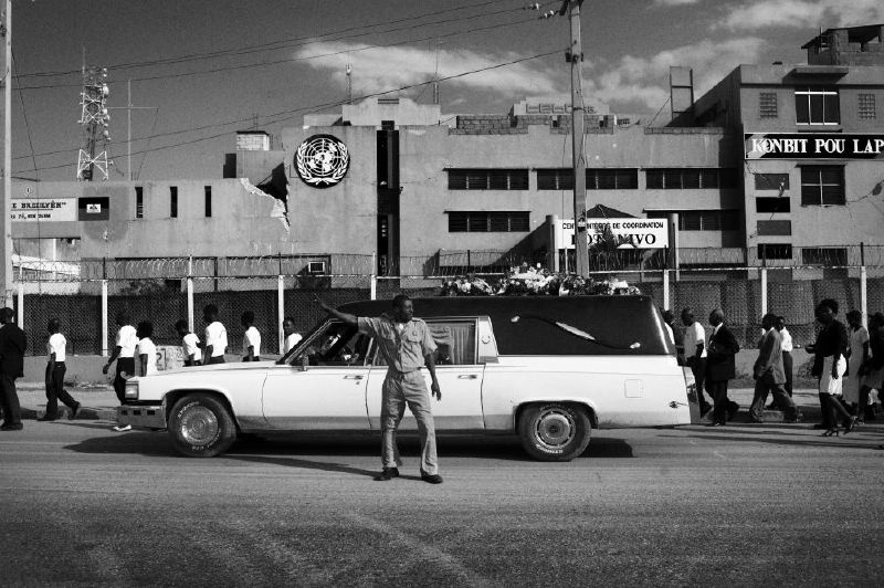 - Un cortejo fúnebre en las afueras de Puerto Príncipe, pasa frente a la oficina de las Naciones Unidas afectada también por el terremoto. Foto: Carlos Cazalis