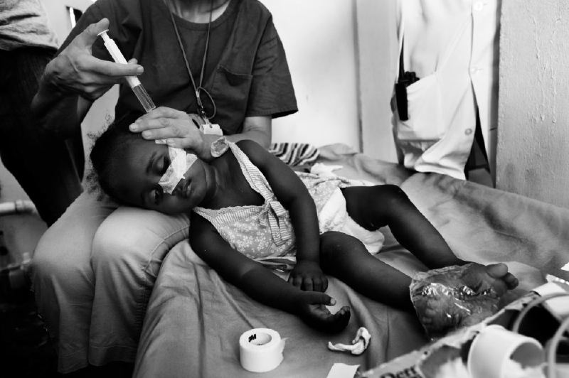 - Un niño haitiano que sufre de deshidratación por la enfermedad del cólera recibe suero a través de la nariz con ayuda de un médico alemán en un hospital de la Cruz Roja en la ciudad de Arcahaie. Foto: Carlos Cazalis