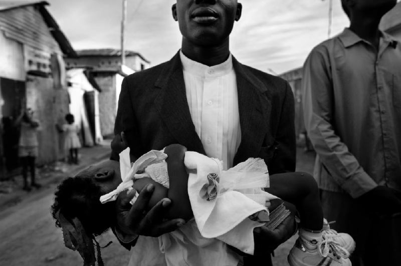 - Un pastor evangelista sostiene entre sus brazos a una pequeña como parte del grupo de haitianos unidos en oración, contra la epidemia del cólera durante la celebración de la misa dominical en la Cité de Soleil, enfermedad que ha matado a más de 1.100 personas e infectado a más de 20.000. Después de la visita a varios templos evangelistas en esa localidad, el mensaje que prevaleció entre los niños fue la historia de David y Goliat. La comunidad de Cité de Soleil ha sido la más afectada por la epidemia, aunque la mayoría de las muertes siguen ocurriendo en las zonas rurales de Artibonite, en la meseta central norte, donde se originó. Foto: Carlos Cazalis