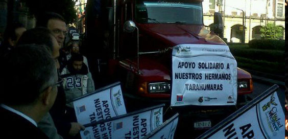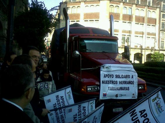 El primer trailer con alimentos donados por la sociedad civil a convocatoria de voluntarios salió hoy a las 9:10 am en la Ciudad de México, para apoyar a los habitantes de la Sierra Tarahumara. El Claustro de Sor Juana ha ofrecido su infraestructura para captar la ayuda; la Fundación Telmex el transporte y el gobierno del Distrito Federal apoyó en la logística.