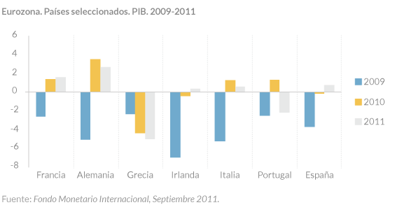 En Estados Unidos, el Departamento del Tesoro reporta un déficit de alrededor del 10% y una deuda pública que supera el 100% con respecto del producto, mientras que la Oficina de Estadísticas Laborales (Bureau of Labor Statistics) sitúa la tasa de desempleo en 8.5 por ciento. No obstante lo anterior, la economía norteamericana parece sortear la crisis con mejores resultados que la región europea. En los últimos dos trimestres de 2011, el crecimiento del producto fue de 1.3 y 1.8% para Estados Unidos, mientras que en la Unión Europea y la Eurozona el dato fue de 0.8 y 1.2%, respectivamente. ¿Qué hace el primero que el segundo ignora?