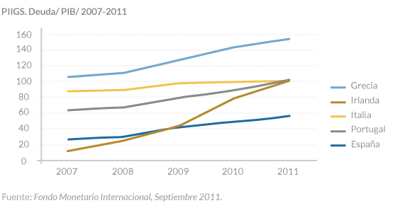 Las condiciones más generales de la crisis de deuda actual, tanto en Europa como en Estados Unidos, obedecen al proceso de liberalización financiera que permitió la creación de grandes excedentes a partir de nuevos instrumentos financieros. Tales excedentes incrementaron la oferta de crédito barato que fue utilizado para diversos fines. En el caso de Grecia, la deuda del gobierno se originó en el incremento del gasto social, mientras que en Portugal la explicación se ha encontrado en la administración ineficaz y el tamaño del gobierno. Irlanda rescató por casi 100 mil millones de euros a los seis bancos que financiaron la burbuja inmobiliaria, y convirtió una deuda privada en una pública. En Italia, el fenómeno podría alegarse estructural, mientras que la deuda en España es un efecto directo del estallido de la burbuja inmobiliaria.