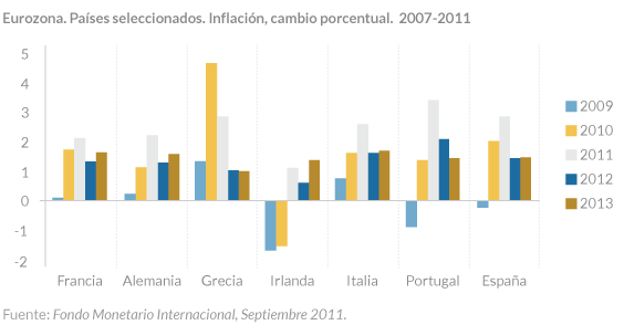 Los temores de resolver la deuda con mayor deuda se focalizan en las presiones inflacionarias, sobre todo en Alemania, para quien la inflación no es un grato recuerdo. No obstante, dicho temor parece infundado cuando observamos que la inflación en la zona se ha mantenido particularmente baja en los últimos años, y las previsiones para los próximos son bastante halagüeñas. En 2009, la inflación promedio en la Eurozona fue de 0.4%, en 2010 el dato fue de 1.76%, mientras que en 2011 casi alcanzó 3 por ciento. Para 2012 y 2013 se espera ligeramente abajo de 2 por ciento.