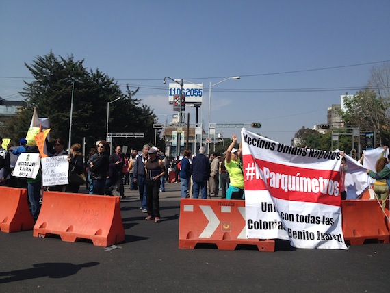 Uno de esos grupos fue el de Vecinos Unidos Nápoles, que se oponen a la operación de parquímetros en la delegación Benito Juárez. Pese a la inconformidad vecinal, los parquímetros comenzaron a operar el pasado mes de noviembre, lo que provocó que los inconformes comenzaran un proceso legal para ampararse contra las autoridades involucradas, entre ellas la delegación y la Autoridad del Espacio Público. Además, el rechazo a los parquímetros los mantiene en manifestaciones diarias, de lunes a domingo, dijo su vocera.