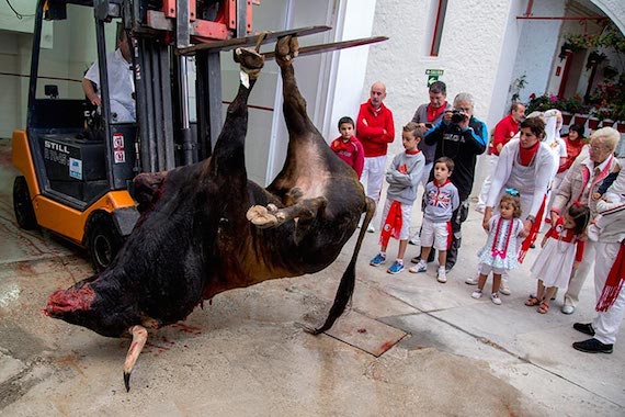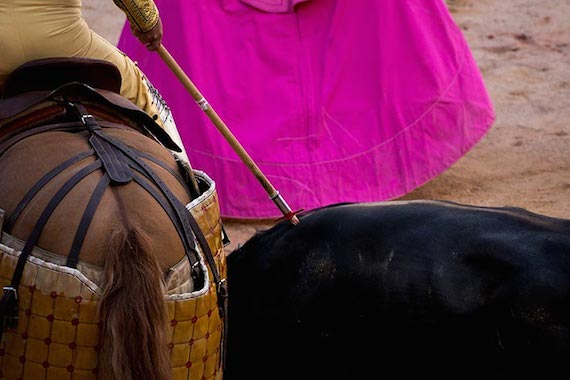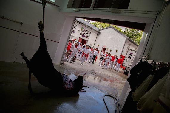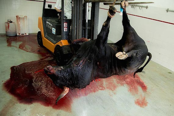 Las fotografías muestran una de las celebraciones taurinas más importantes del mundo y busca exponer la tensión entre los defensores de los animales y quienes defienden la matanza de decenas de toros y el abuso de otros animales amparándose en viejas costumbres, "contra toda lógica".
