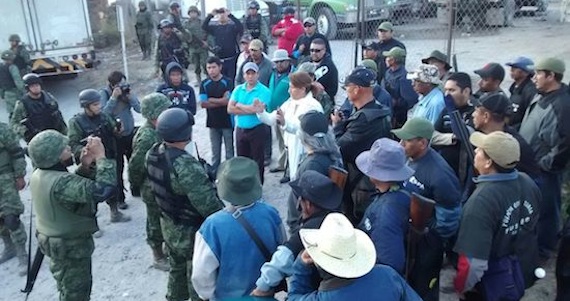 Ante el despliegue armado del Gobierno federal y estatal los manifestantes se trasladaron al lugar en más camionetas con policías comunitarios y vecinos de Petaquillas, quienes exigieron la salida de los soldados.