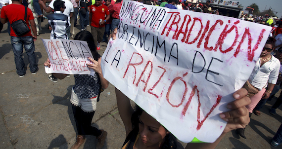 Un grupo de participantes arremetió contra los manifestantes que se oponían a la actividad. Los activistas rechazaron el evento por considerar que los toros pasan un calvario durante su celebración. Los activistas llevaban carteles que decían “ninguna tradición por encima de la razón” y "violencia, vergüenza".