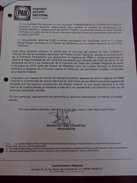 Ante esto, Mauricio Tabe Echartea, presidente del PAN en el DF, envió una solicitud por escrito al CEN panista para pedir que se revisara el “veto ilegal” que había realizado el organismo a cargo de Segura Rangel.
