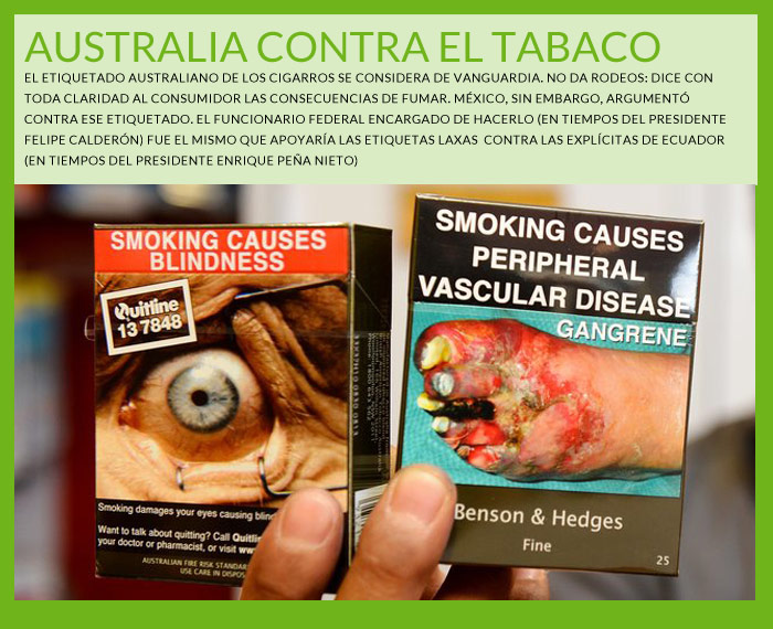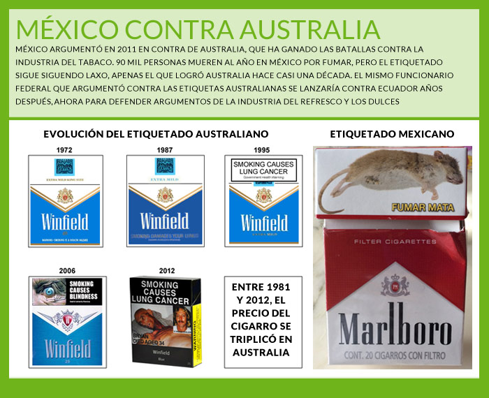 En aquel año, a través de la Secretaría de Economía, Juan Antonio Sánchez Dorantes, mismo personaje que firmó el documento de defensa de las empresas de azúcares, expresó en un documento la “preocupación” del Estado mexicano por las medidas emprendidas por Australia para implementar el empaque genérico en las cajetillas de cigarros.