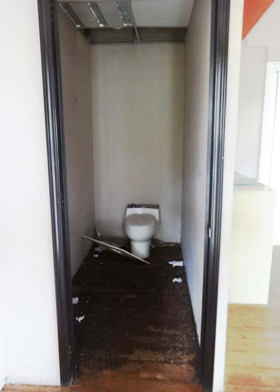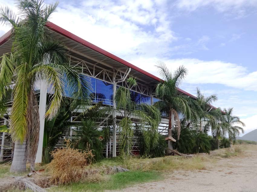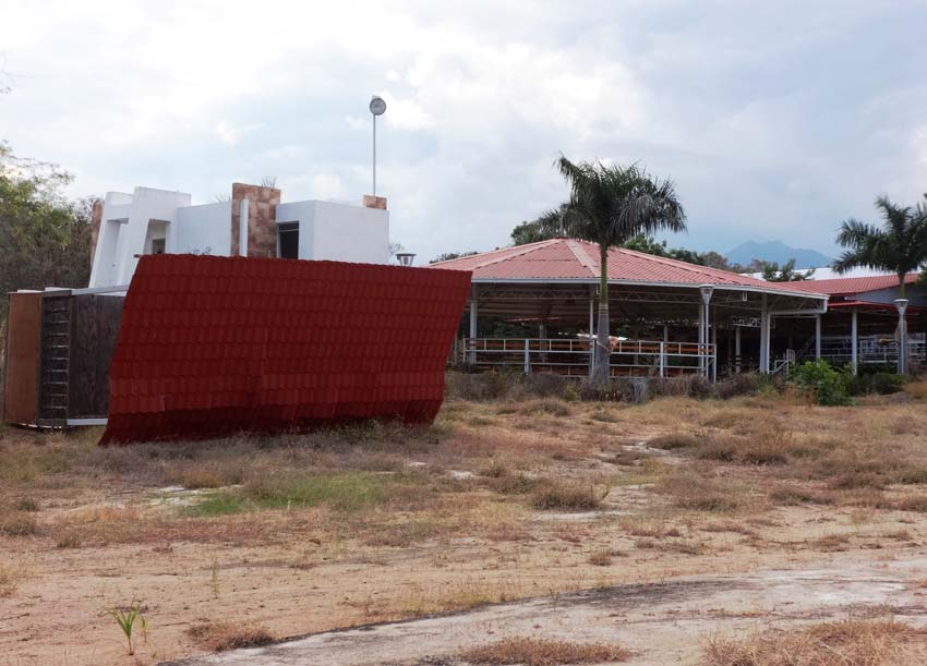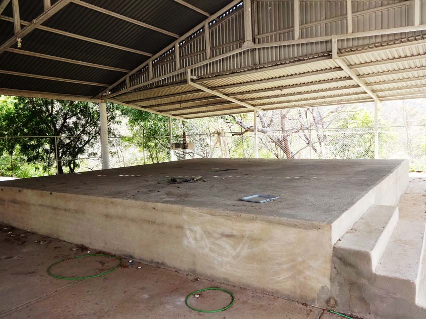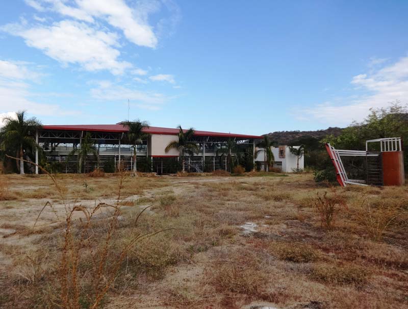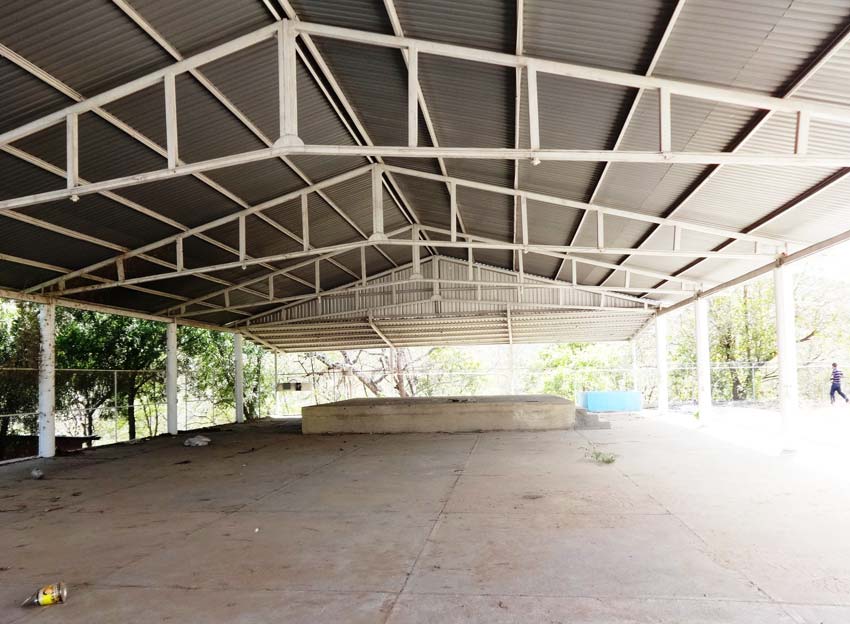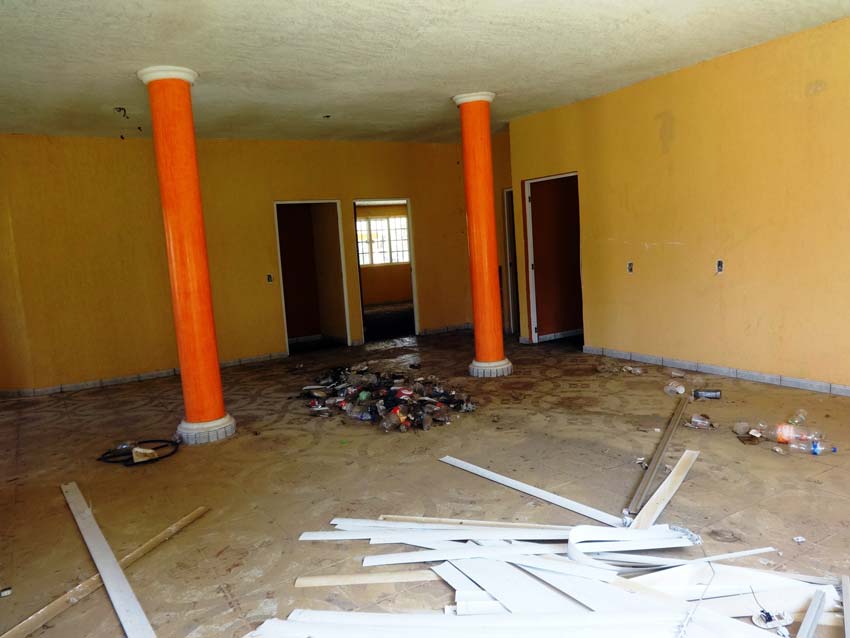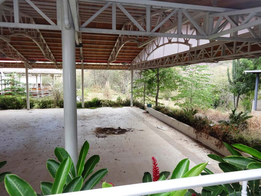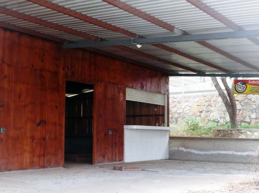Luego está una plancha de concreto techada que funcionó como pista de baile o salón de eventos con un pequeño escenario. Al fondo, se conserva una bodega construida como tienda con una lámina de Sabritas colgada.