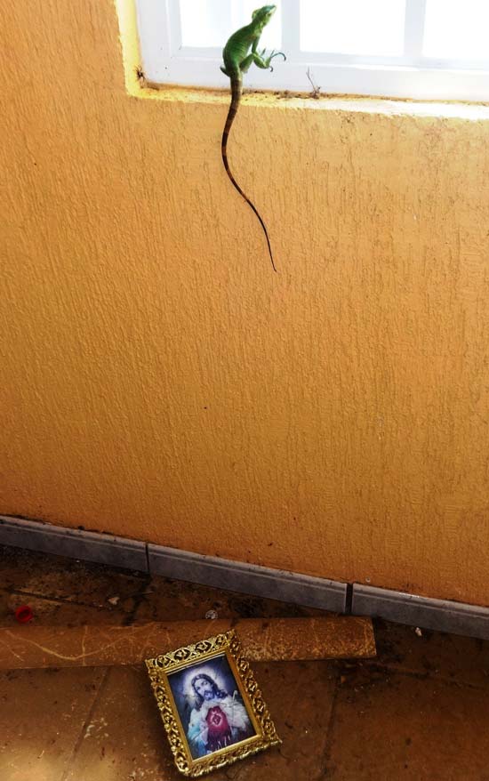 Una iguana verde trata de escabullirse por una ventana y derriba un cuadro con la imagen del Sagrado Corazón de Jesús. El sitio está pintado de amarillo canario con detalles naranjas.