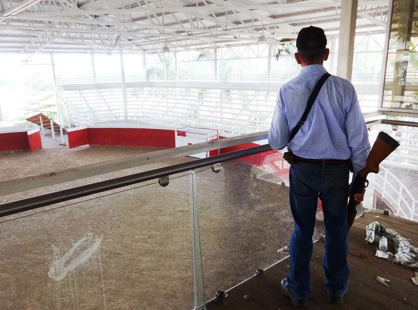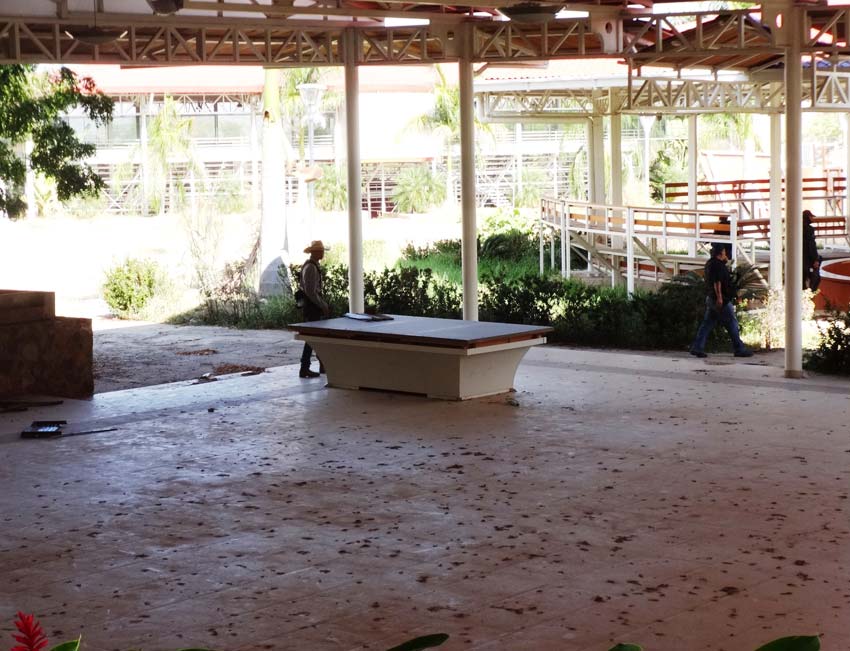 Hacia adentro de la Fortaleza de Annunaki, continúa el palenque de gallos cuyo aro permanece forrado con madera. Atrás, un edificio de concreto y diseño moderno funcionó como casino. Hubo mesa de Black Jack, póquer, ruleta y dados. Ahora queda una mesa con fieltro verde y pedazos de plástico de varios colores, similares a los ocupados por los pueblos en las fiestas religiosas. No hay manera de esculcar nada, porque el sitio es un torbellino de afrodisiacas avispas gigantes.