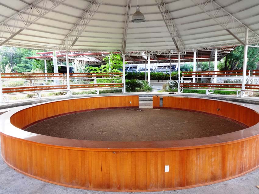 En La Fortaleza, el espacio más llamativo es el dedicado a la monta de toros, un ruedo techado con capacidad para mil personas sentadas e iluminación artificial, sitio único en Michoacán. En medio del graderío, un cuarto con puerta de vidrio y letrero de “Palco Privado” funciona como un juego de palabras sobre el apodo de su dueño: pa’l loco y privado, aquí como reiteración de la demencia, El Más Loco.